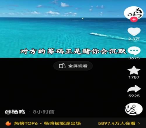 杨鸣在深夜凌晨两点多,通过社媒发布视频,自然是对于被驱逐的回应:“你必须学会回击每一个不尊重你的人,遭遇欺压时不必害怕将事态扩大,对方的筹码正是赌你会沉默。沉默换不来理解,只能换来得寸进尺,你越是没脾气,别人越会对你苛刻,一次坚定的反击,就会有八成的几率会被尊重。”