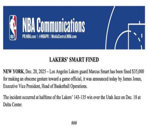 北京时间12月21日,NBA官方宣布,湖人后卫马库斯-斯马特因“向赛场裁判做出不雅手势”,被处以3.5万美元罚款。
