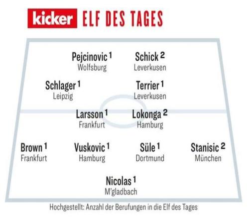 后卫:纳撒尼尔-布朗(法兰克福)、卢卡-武什科维奇(汉堡)、聚勒(多特)、斯塔尼希奇(拜仁)