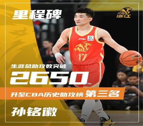 CBA常规赛第10轮,浙江方兴渡再战北京北汽。双方在比赛的大部分时间里处于胶着态势,末节在胡金秋的带领下,帮助浙江方兴渡占据场上优势,赢下本场比赛。最终,浙江方兴渡77-74战胜北京北汽,豪取8连胜。本场比赛,孙铭徽CBA生涯总助攻数达到2658次,超越郭艾伦(2649次)升至CBA历史助攻榜第3。