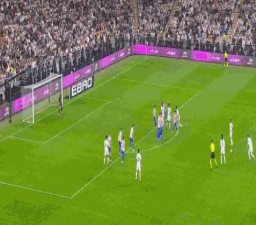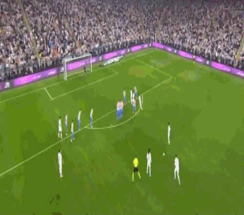 第2分钟,世界波!巴尔韦德任意球直接轰入死角,皇马1-0